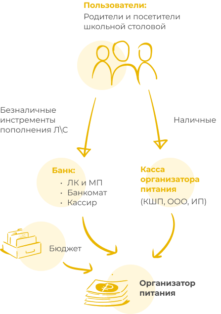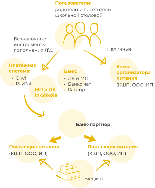 Организация поступления денежных средств на расчётный счёт организатора питания данным способом, предполагает участие в приёме безналичных денежных средств третьей стороны Оператора и расчётного банка-партнёра. Согласно Федерального закона от 27.06.2011 г. № 161-ФЗ «О национальной платёжной системе» денежные средства плательщиков размещаются в форме электронных денежных средств (ЭДС) в банке-партнёре. Электронные записи о размещённых в банке ЭДС Пользователей формируются автоматически согласно закону, без необходимости посещения банка. В адрес организатора питания денежные средства поступают по факту совершения покупки учащимся. В момент совершения покупки учащимся, система фиксирует факт покупки и передаёт данную информацию в банк-партнёр. На основании полученной информации банк-партнёр совершает перевод денежных средств на расчётный счёт организатора питания.